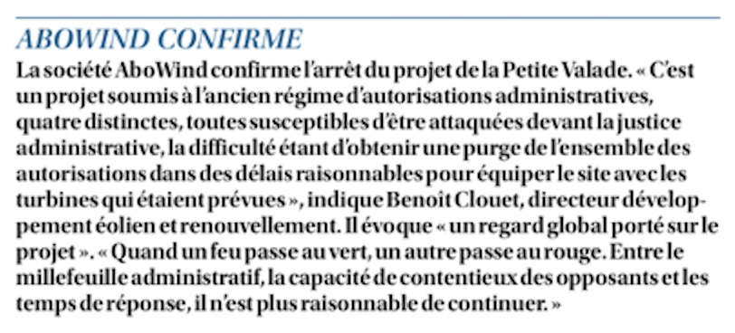 8 janvier 2026 - Abo Wind se désiste de l'audience prévue au Conseil d'État et abandonne ainsi le projet éolien de Maransin, situé dans la forêt de la Double girondine. Ce projet dit de "la Petite Valade", lancé en 2012, prévoyait l'installation de cinq éoliennes de 180 mètres de haut. L'engagement et la détermination des élus locaux pour refuser ce mauvais projet ont été déterminants pour aboutir à cette issue.