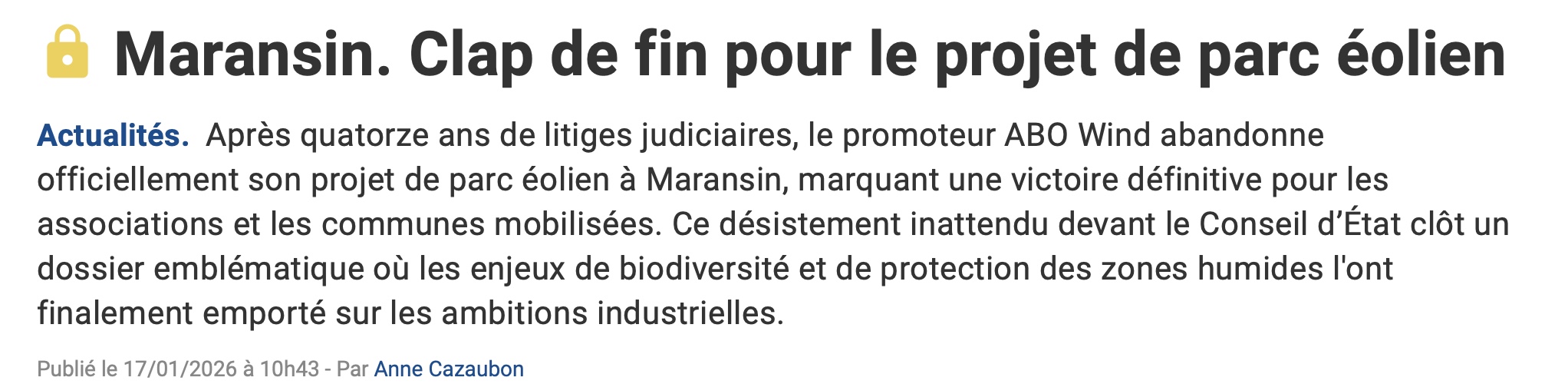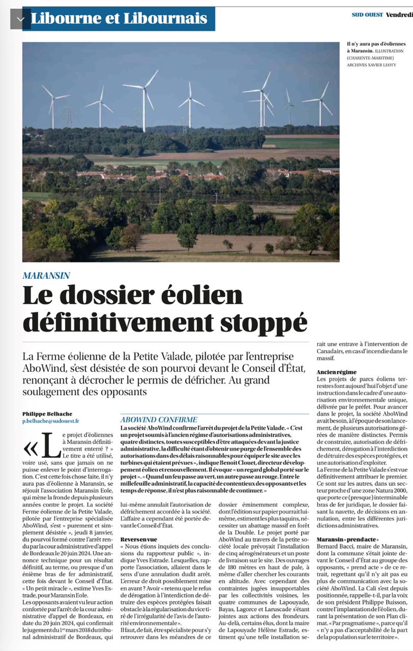 8 janvier 2026 - Abo Wind se désiste de l'audience prévue au Conseil d'État et abandonne ainsi le projet éolien de Maransin, situé dans la forêt de la Double girondine. Ce projet dit de "la Petite Valade", lancé en 2012, prévoyait l'installation de cinq éoliennes de 180 mètres de haut. L'engagement et la détermination des élus locaux pour refuser ce mauvais projet ont été déterminants pour aboutir à cette issue.