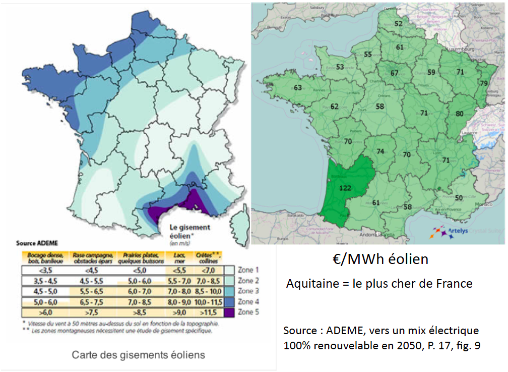 Le vent y est-il puissant et régulier ? Non. L'ADEME admet que l'éolien n'a pas sa place en Aquitaine - ce serait un non-sens économique - et que cette région occupe une place unique en France : l'électricité éolienne d'Aquitaine serait 52% plus chère que la région qui la suit (Franche-Comté) et 144% plus chère que la région la mieux placée (PACA).